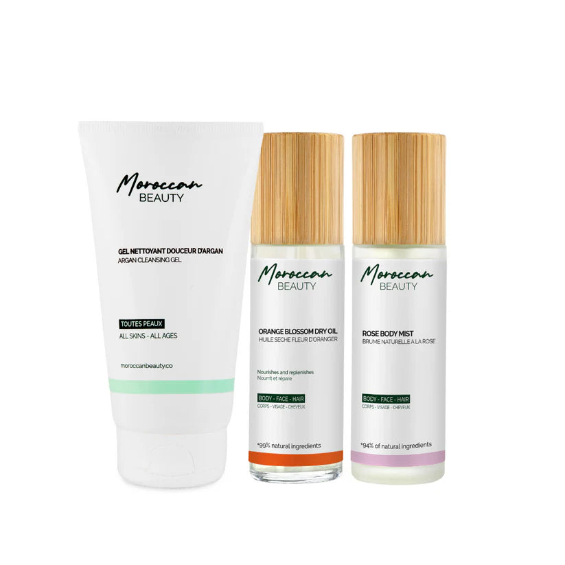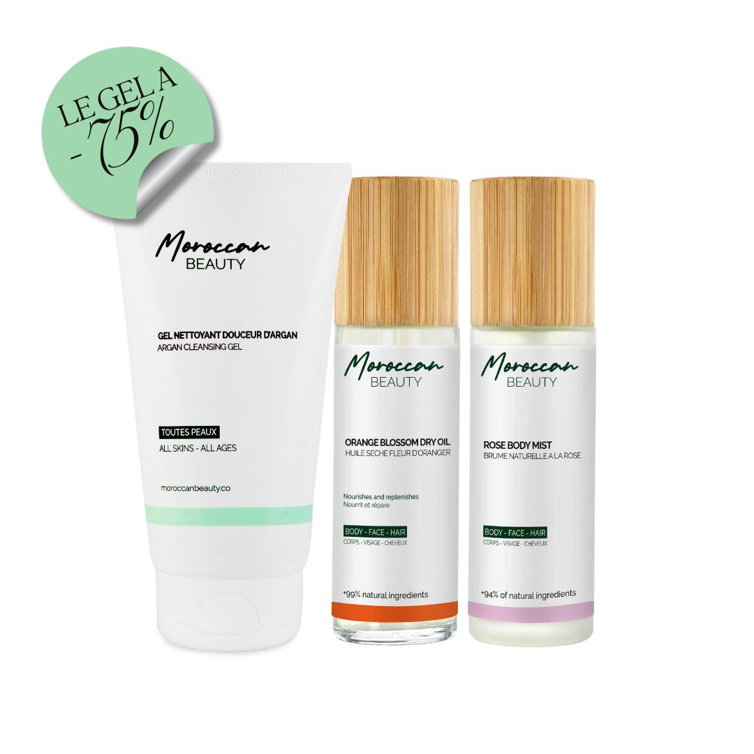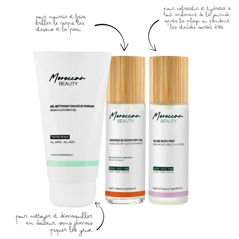 Keep your skin hydrated and fresh all summer long with the Summer Set . Indulge in the Orange Blossom Dry Oil , a true blend of hydration and nourishment for the body, face, and hair. Enriched with sesame oil and orange blossom , it intensely hydrates without leaving a greasy residue, while providing a subtle glow and delicate fragrance. Next, spray the Rose Body Mist to envelop your skin in a soft veil of freshness and extend hydration throughout the day. For a complete skincare routine, the Moroccan Elixir , rich in 8 natural oils , deeply nourishes and stimulates skin repair , while Moroccan Argan Oilhydrates , improves elasticity , and soothes the skin, promoting healthy hair growth .